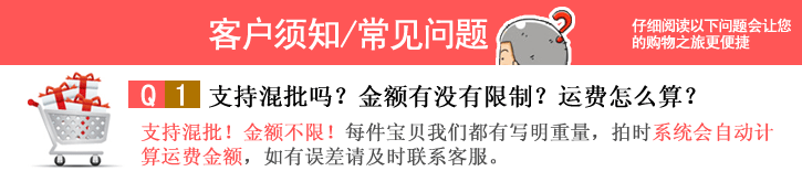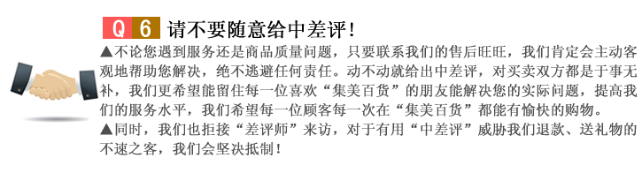 差问题:所有商品都是实物拍摄,尽量让颜色看起来接近实物,对一点色差都不能容忍的顾客请慎重!以免超成不必要的金钱时间浪费。2.尺寸问题:请买家再购买前详细看产品说明或与我们先沟通,拍买时请说明你要的产品颜色和尺寸,否则我们将默认按标题描述发货。3.快递问题:快递因所在城市不同,运送速度也不一。特别是遇到恶劣天气以及法定节假日,都会有延迟耽搁现象。另外快递公司每个网点的业务员素质也不一,中间可能出现个别网点业务员态度不好或者包裹损坏等,一些卖家无法预知的意外因素。总之有什么不愉快请联系我们,我们会积极跟快递公司沟通解决的。4.商品丢失:一般出现商品丢失情况都是因为包裹被破坏造成,如果发现包裹胶带被替换毁坏或者被撕开,断裂,有拆封的痕迹,请不要签收。如果包裹未经核查就签收那出现的商品缺失、短少或者运输造成的事故,我们很难承担责任,希望大家理解。如果是保安或者代签的,请事先告知他们校对包裹内的商品。5.质量问题:能拆开的东西发货前我们都会尽量拆开再三核对和严格检查,尺寸和颜色问题不是我们发货疏忽引起的,如需调换运费由买家承担,如果确实在收到后发现质量问题请在收到的48小时内及时联系我们,提供相关图片证据,一定为您妥善解决,邮费我们承担。注意:内裤和袜子不接受任何使用后的调换和退货!请在适用前仔细检查!由于每个顾客要求不同,是不可能做到在任何顾客眼里都是十全十美的。某些丝毫不影响穿着适用的小瑕疵希望各位不要太认真计较。6.关于评价:我们会尽一切的努力以价格质量,以德服人,创造公正和谐的购物环境,升级国民的购物环境和习惯,网上购物好处多,需要大家共同珍惜共同去努力维护,用良心去对待每一笔买卖行为!我们将努力追求100%好评,十分欢迎大家对我们合理评价。确实交易出了问题,先要取得沟通,化解误会和矛盾,可以协商解决,是我们的疏忽和责任我们会认真负责对待。理解和尊重是相互的!对某些心怀不轨和阴谋的买家请远离这片净土!联系我们: